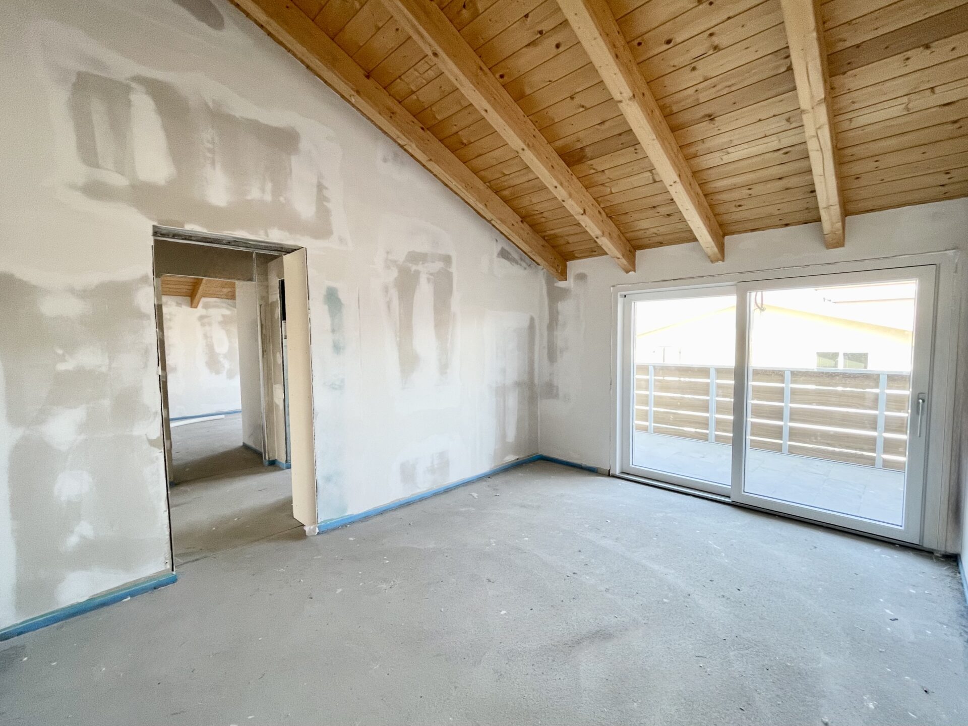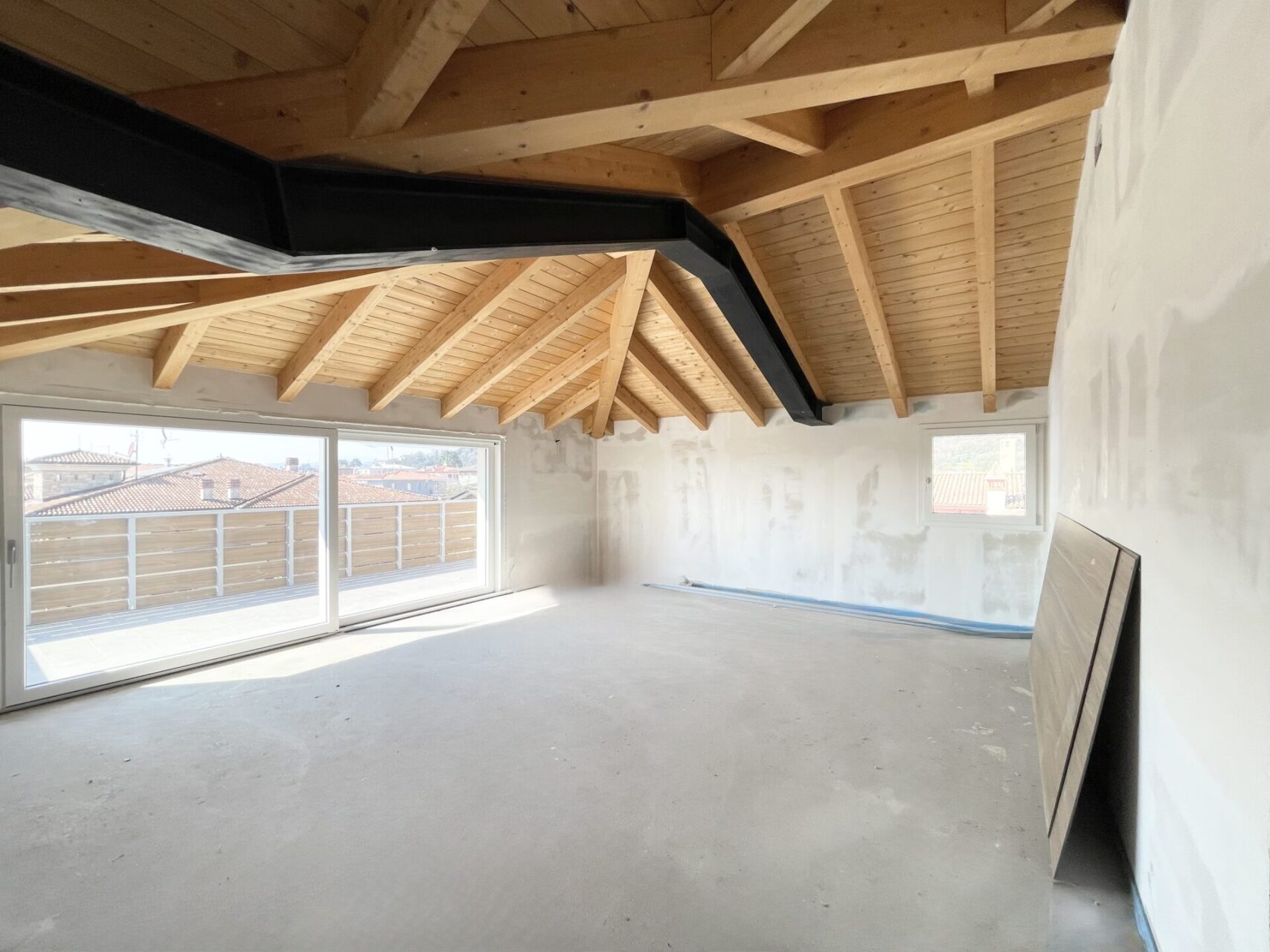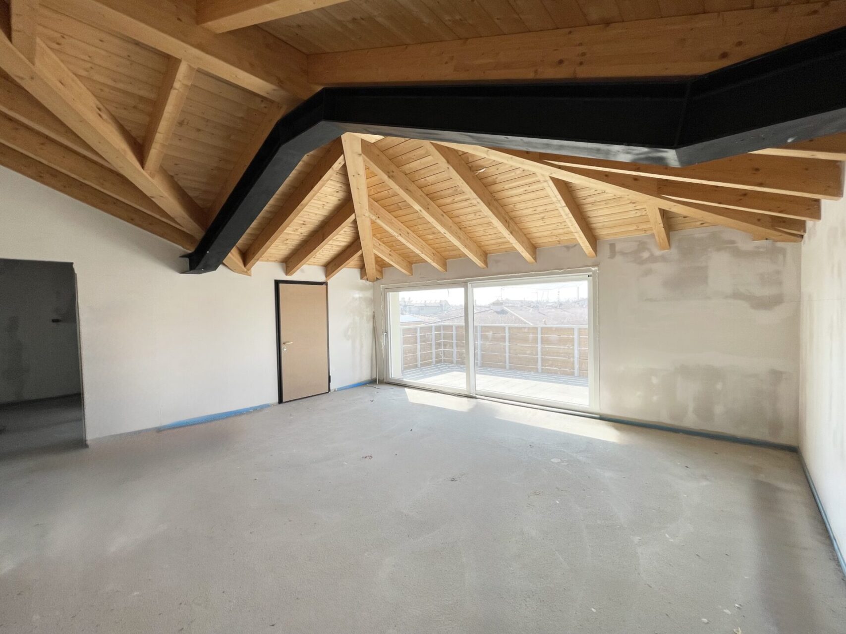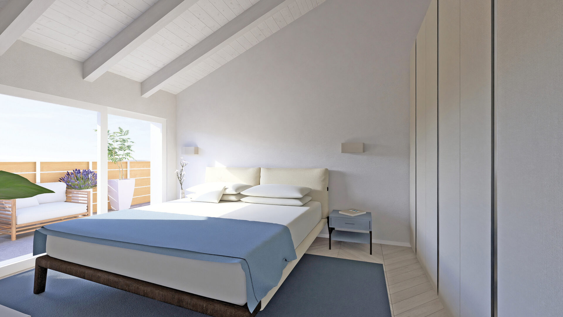 Attico con ingresso diretto nel luminoso soggiorno/cucina con porta scorrevole che accede alla terrazza rivolta ad ovest, camera matrimoniale, due camere singole, bagno finestrato, un bagno/lavanderia con portafinestra che accede alla terrazza ad est;