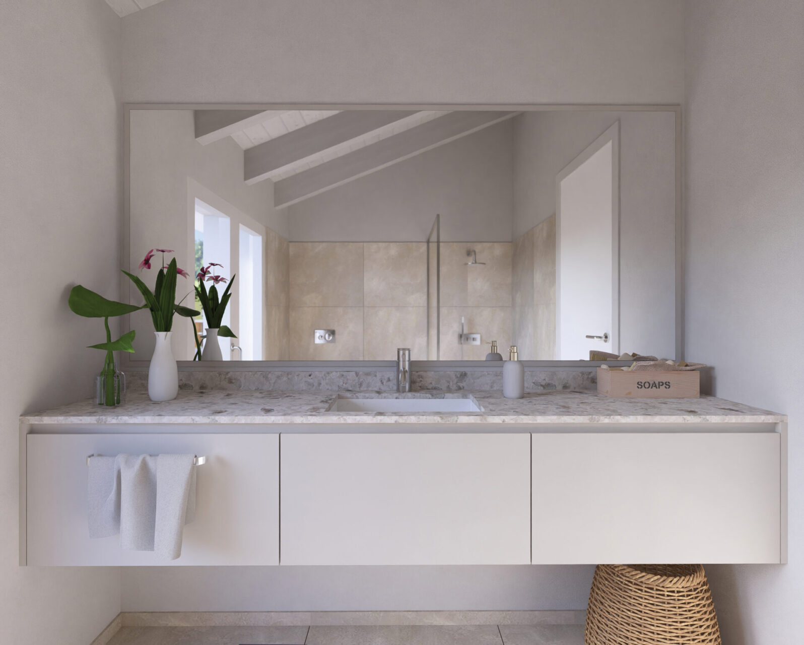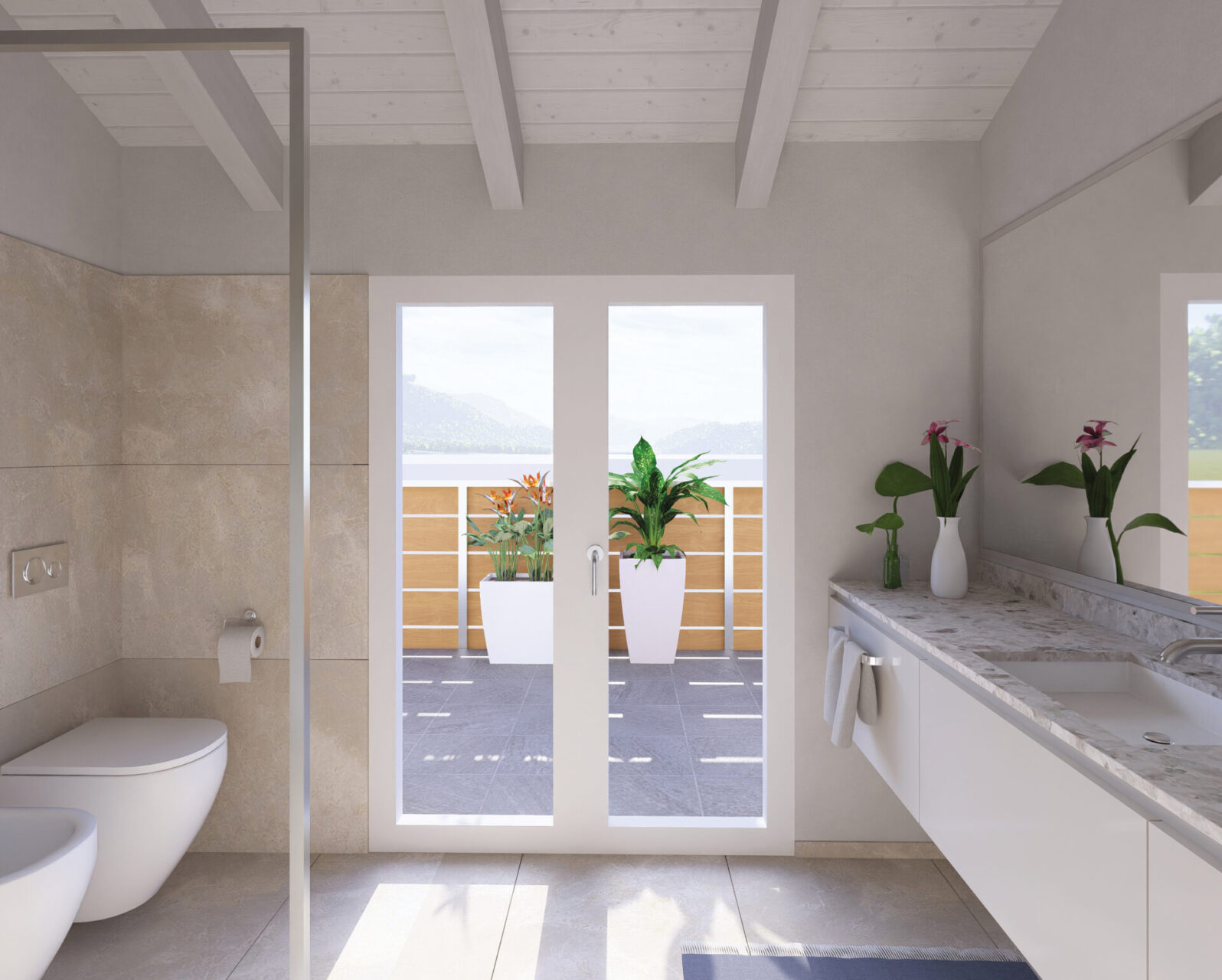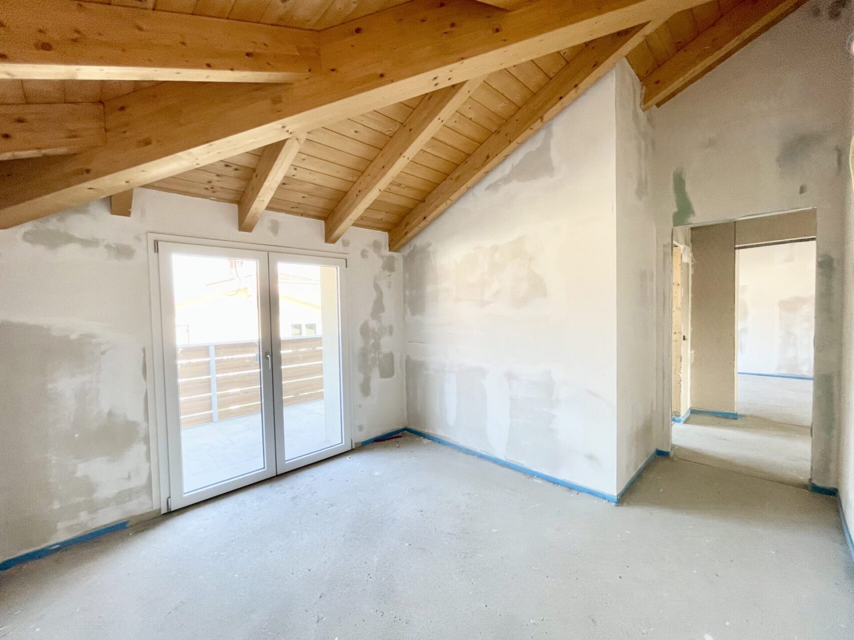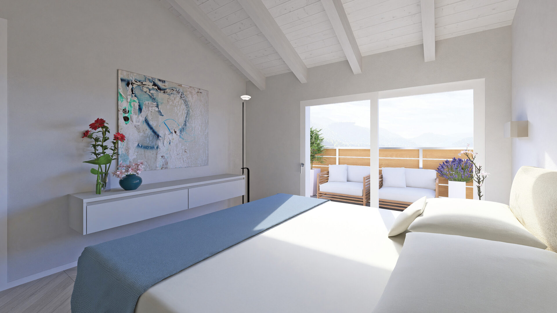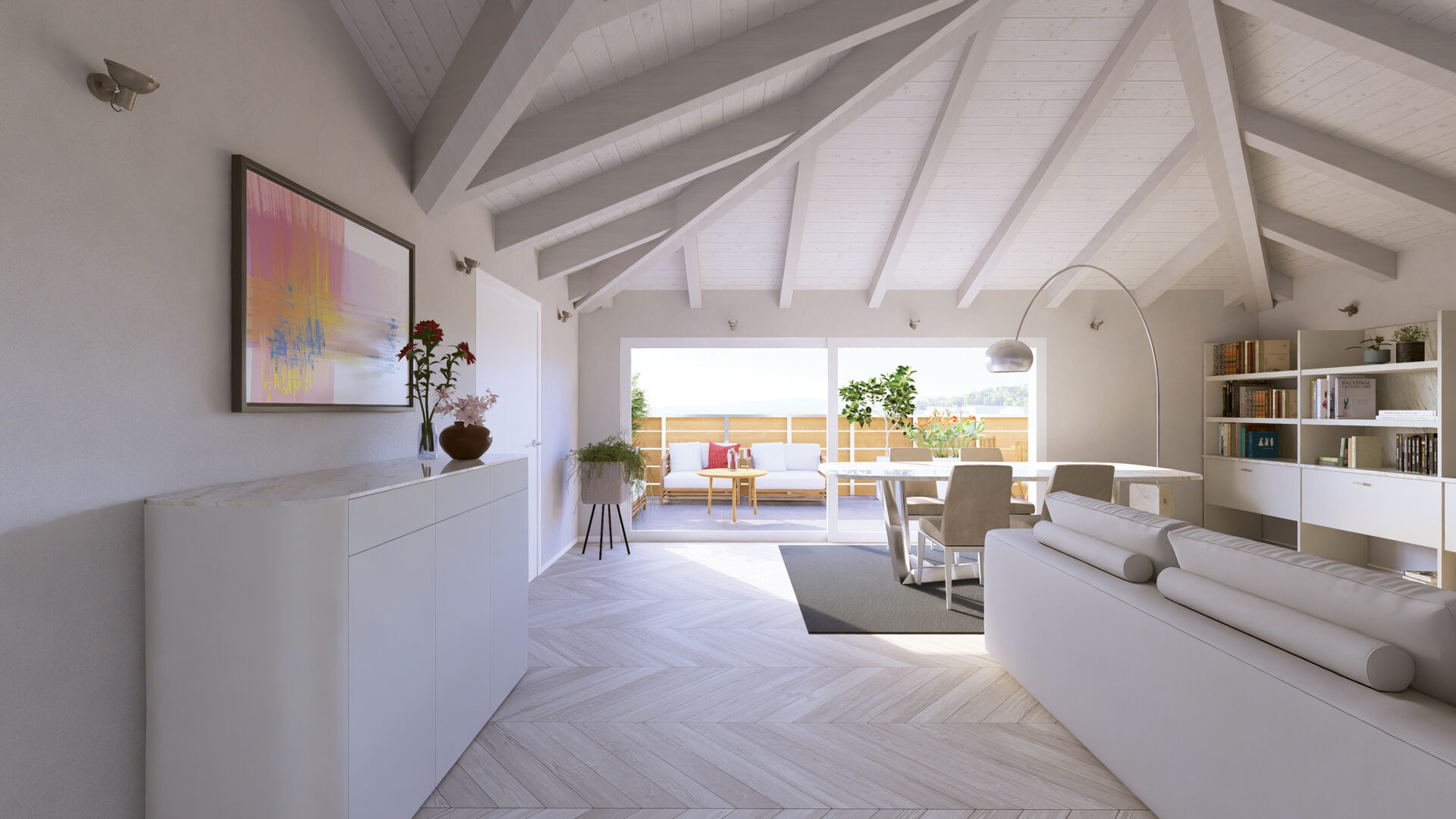 Attico con ingresso diretto nel luminoso soggiorno/cucina con porta scorrevole che accede alla terrazza rivolta ad ovest, camera matrimoniale, due camere singole, bagno finestrato, un bagno/lavanderia con portafinestra che accede alla terrazza ad est;