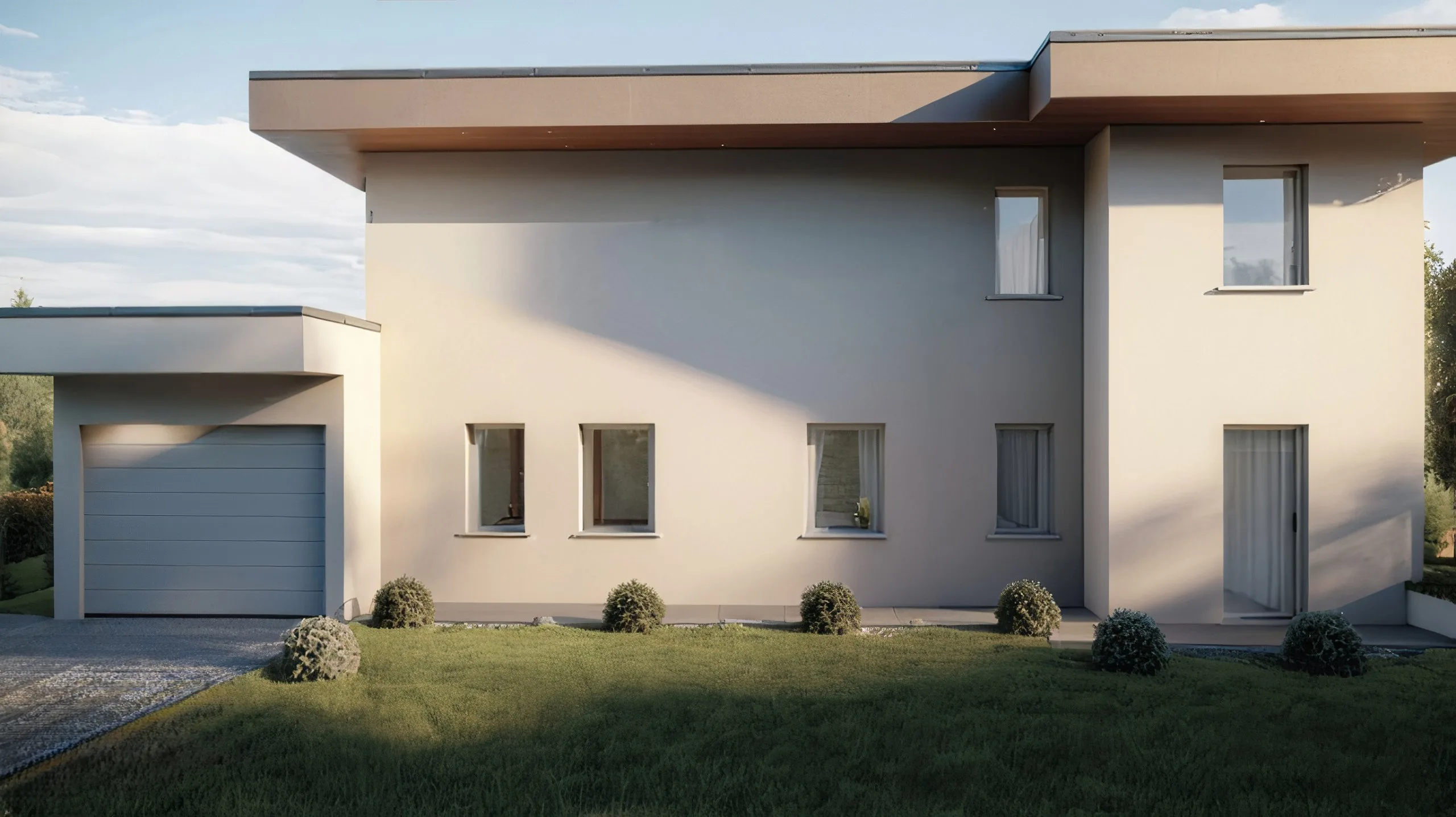 Buyers can choose flooring, bathroom finishes, and interior doors. Underfloor heating with heat pump, pre-installation for air conditioning and alarm system, 2.2 kW photovoltaic system.