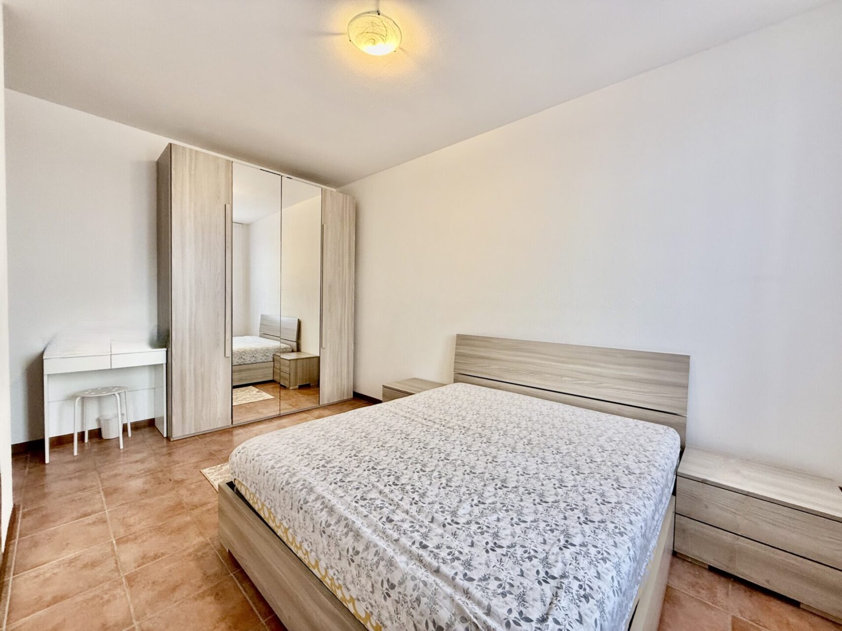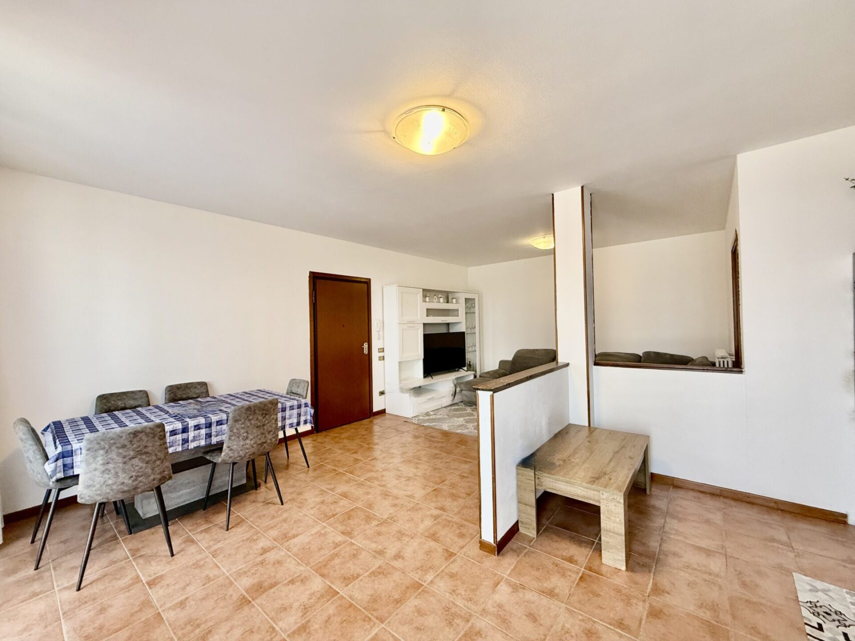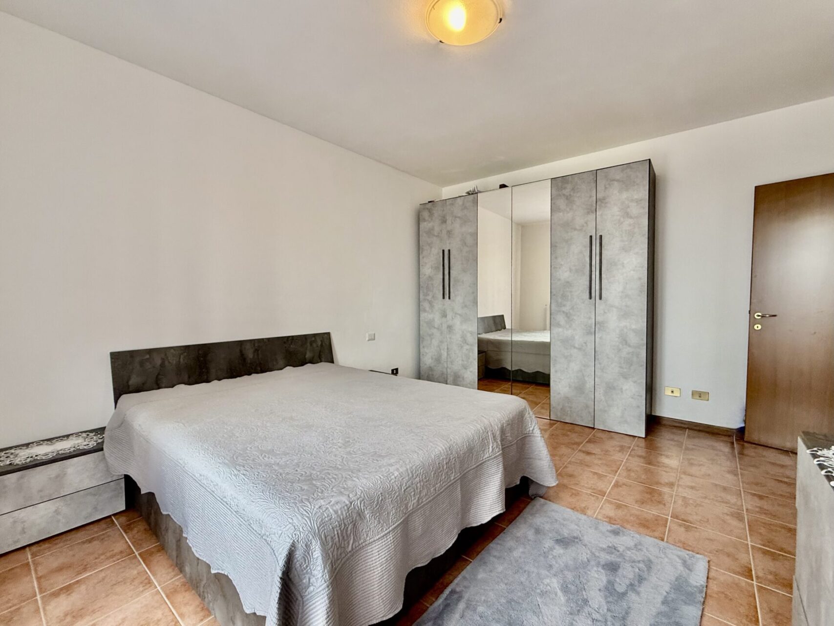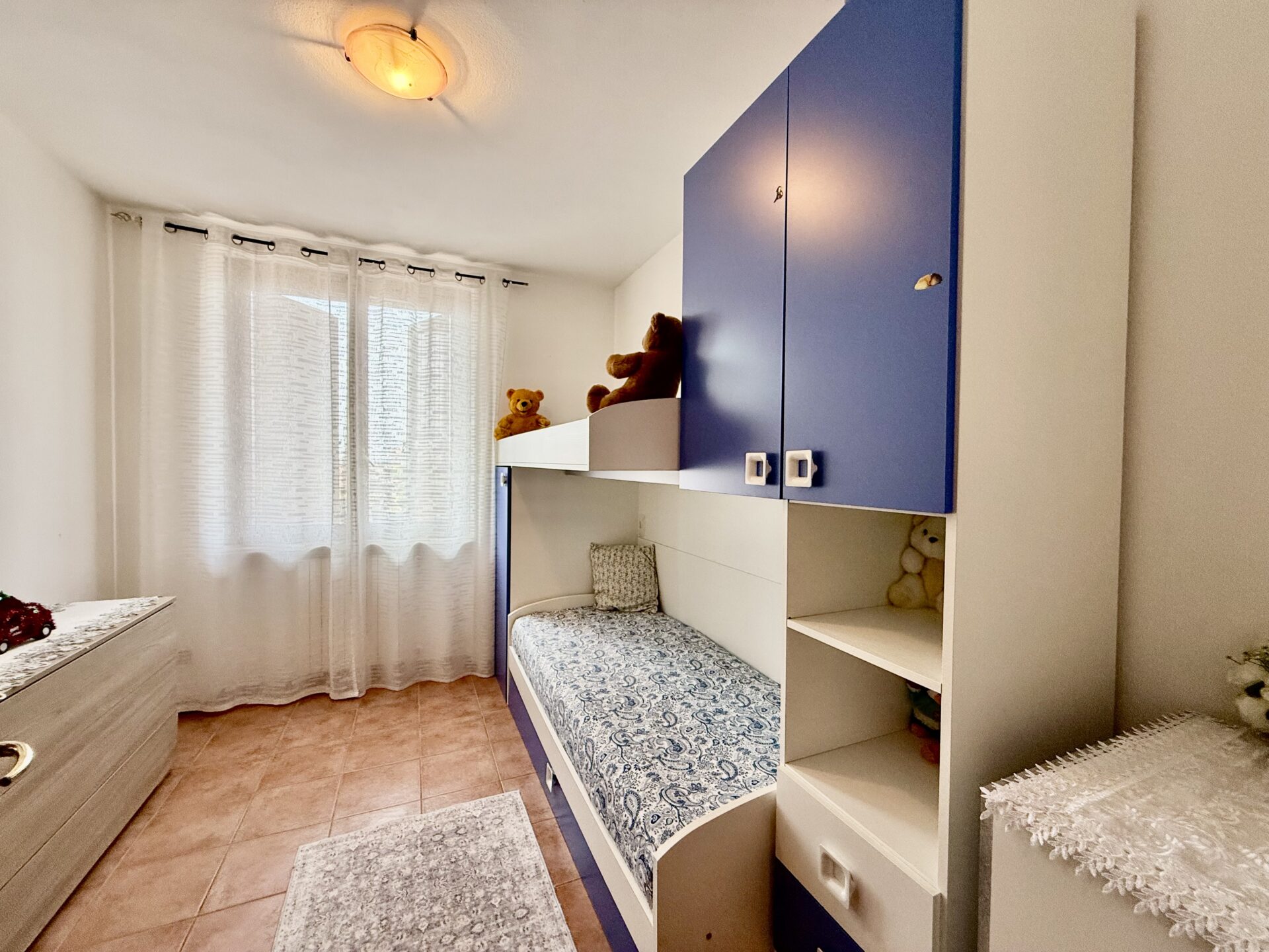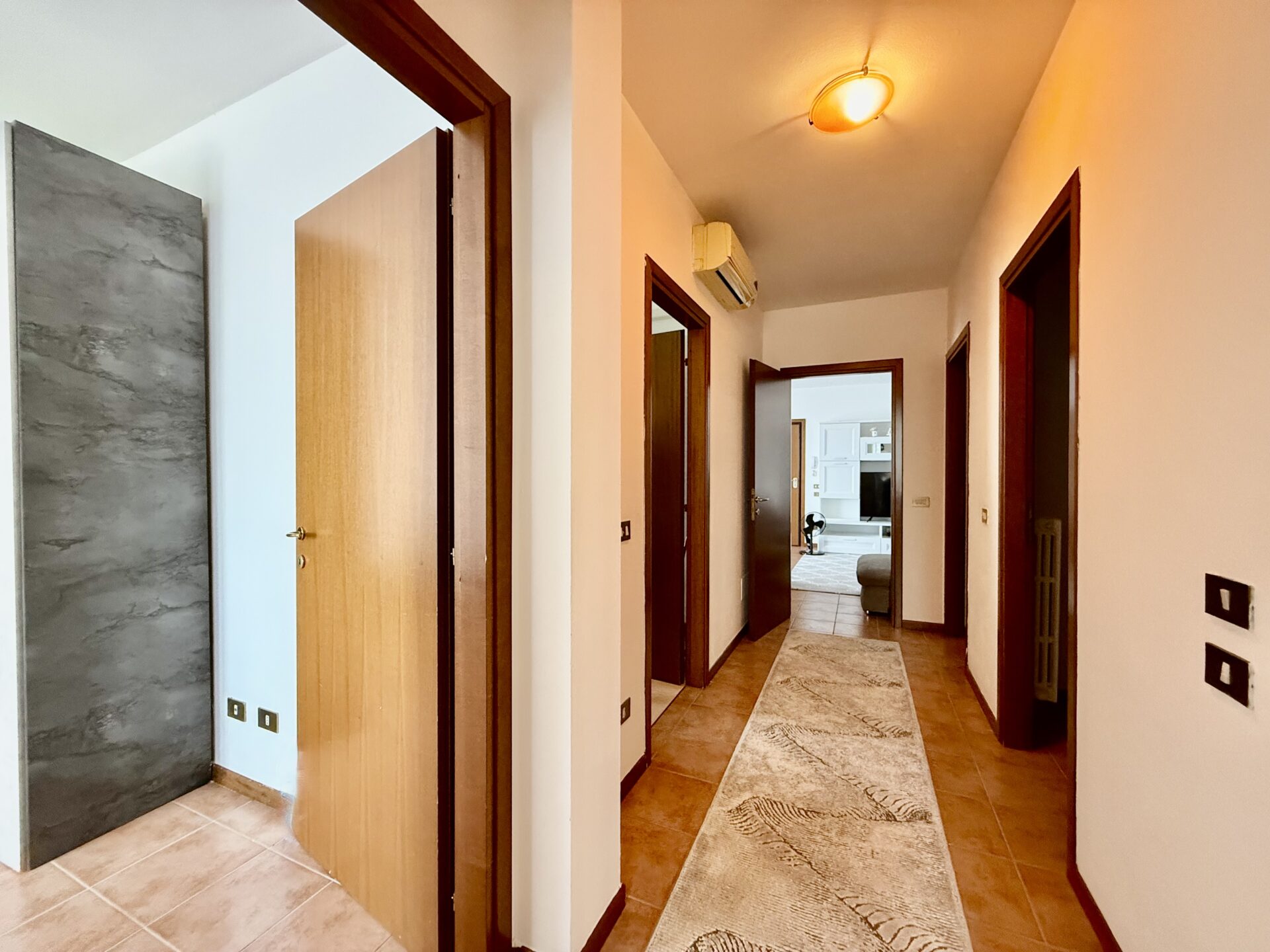 L’ingresso diretto in soggiorno con cucina a vista con grande balcone, disimpegno che divide il reparto notte con due camere dalle dimensioni matrimoniali, camera singola, bagno/lavanderia, due ripostigli.