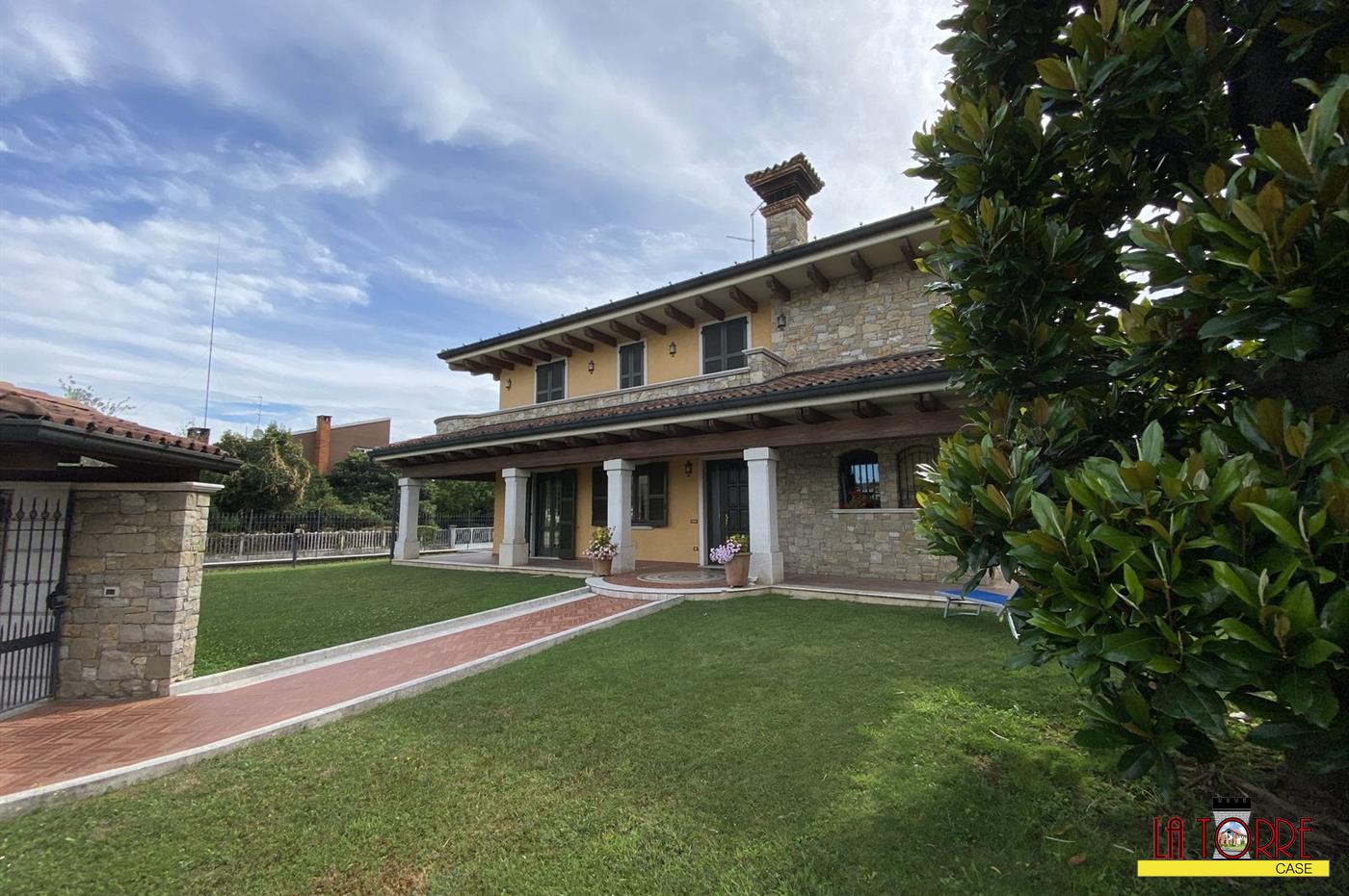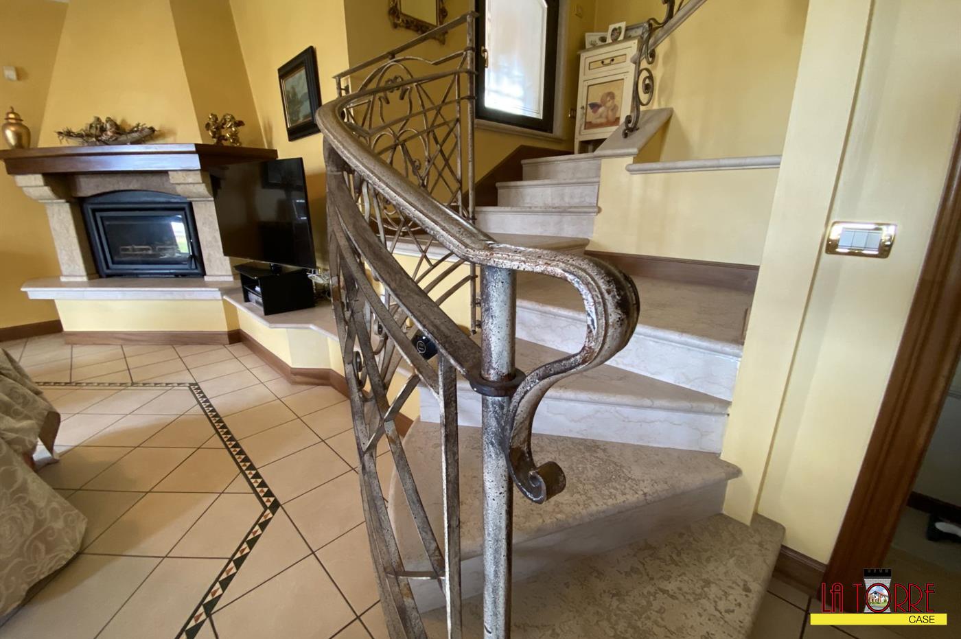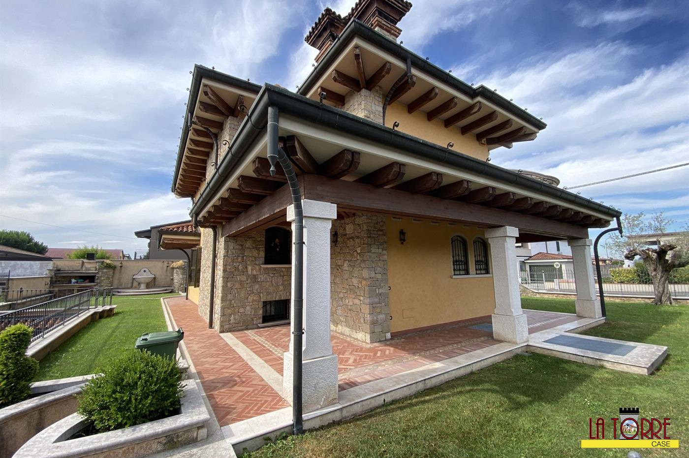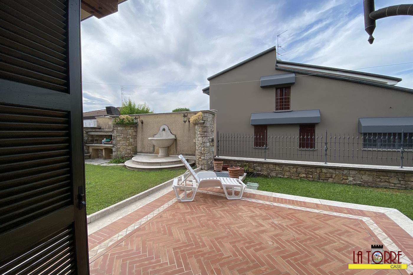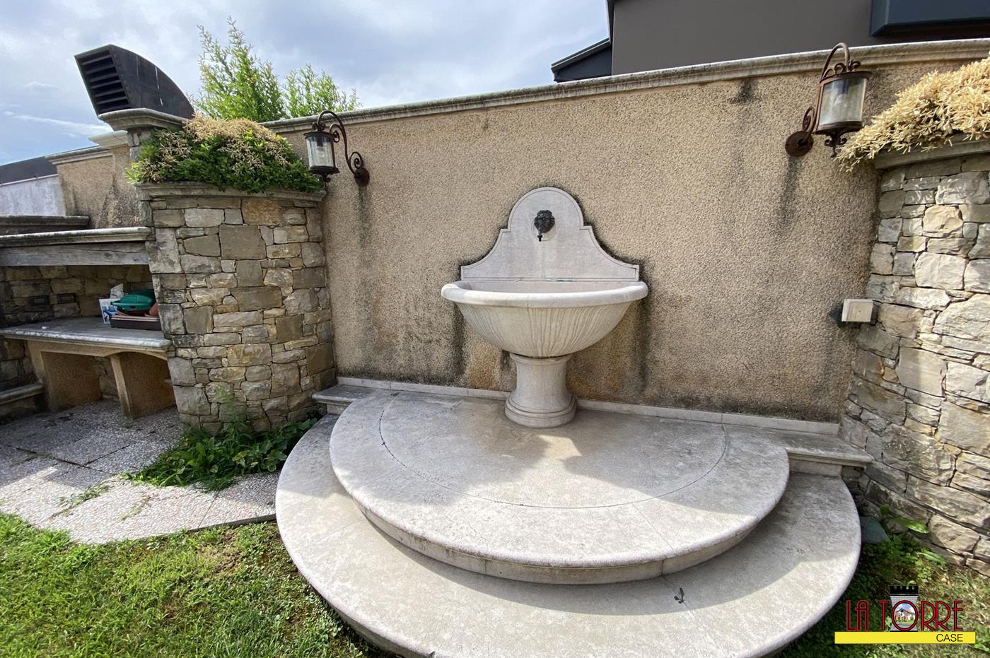 The property includes elegant finishes such as a wrought iron gate and fence, Botticino marble columns, outdoor terracotta paving, and marble windowsills. The garden, modest in size, features a stunning marble fountain placed near a barbecue area built with natural stone.