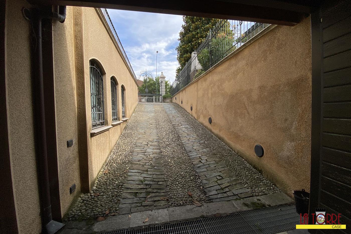 Cancellino e recinzione in ferro battuto. Pilastri in marmo di botticino, pavimentazione esterna in cotto.