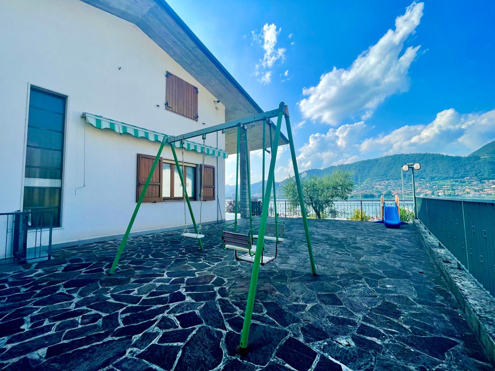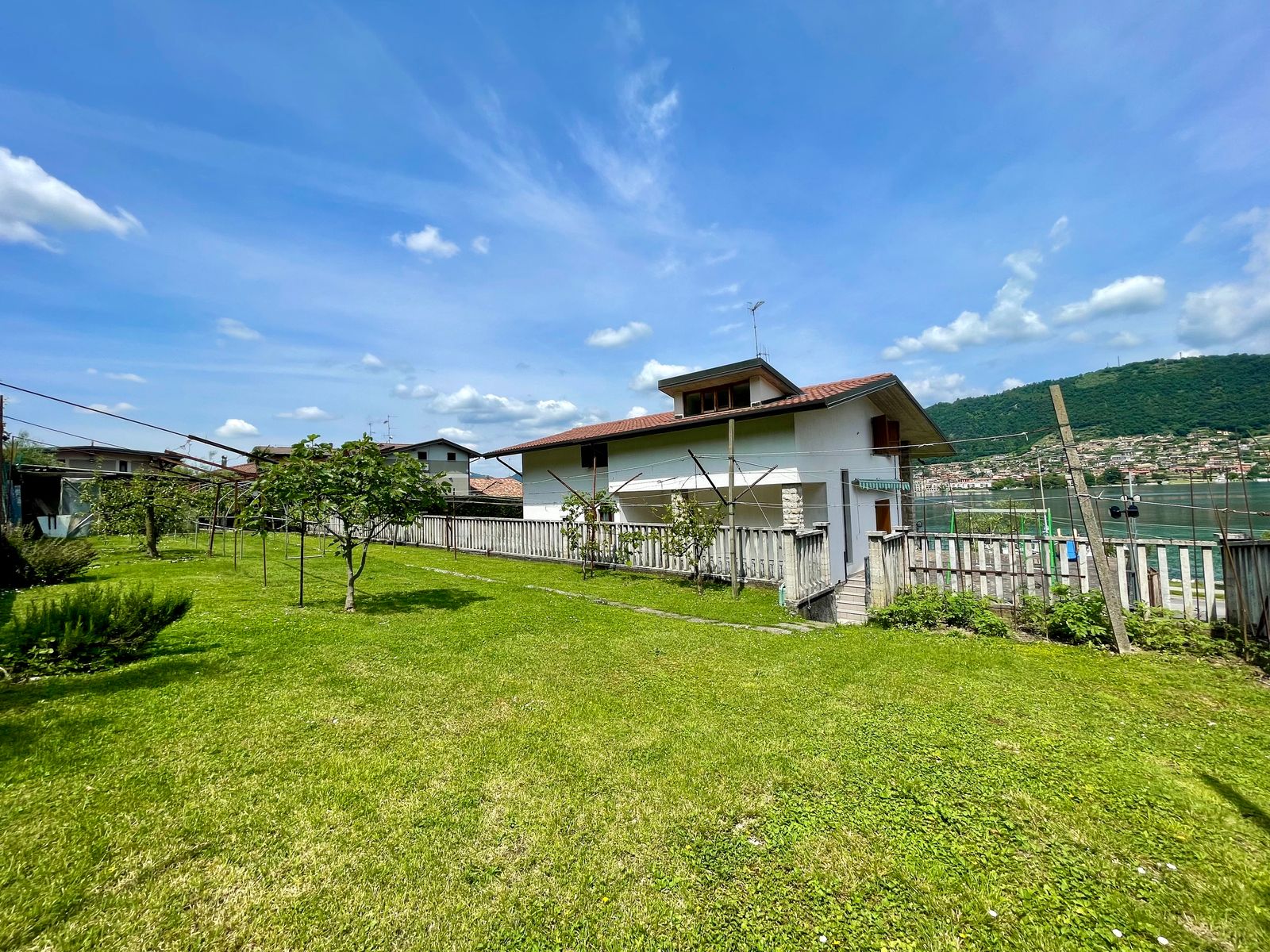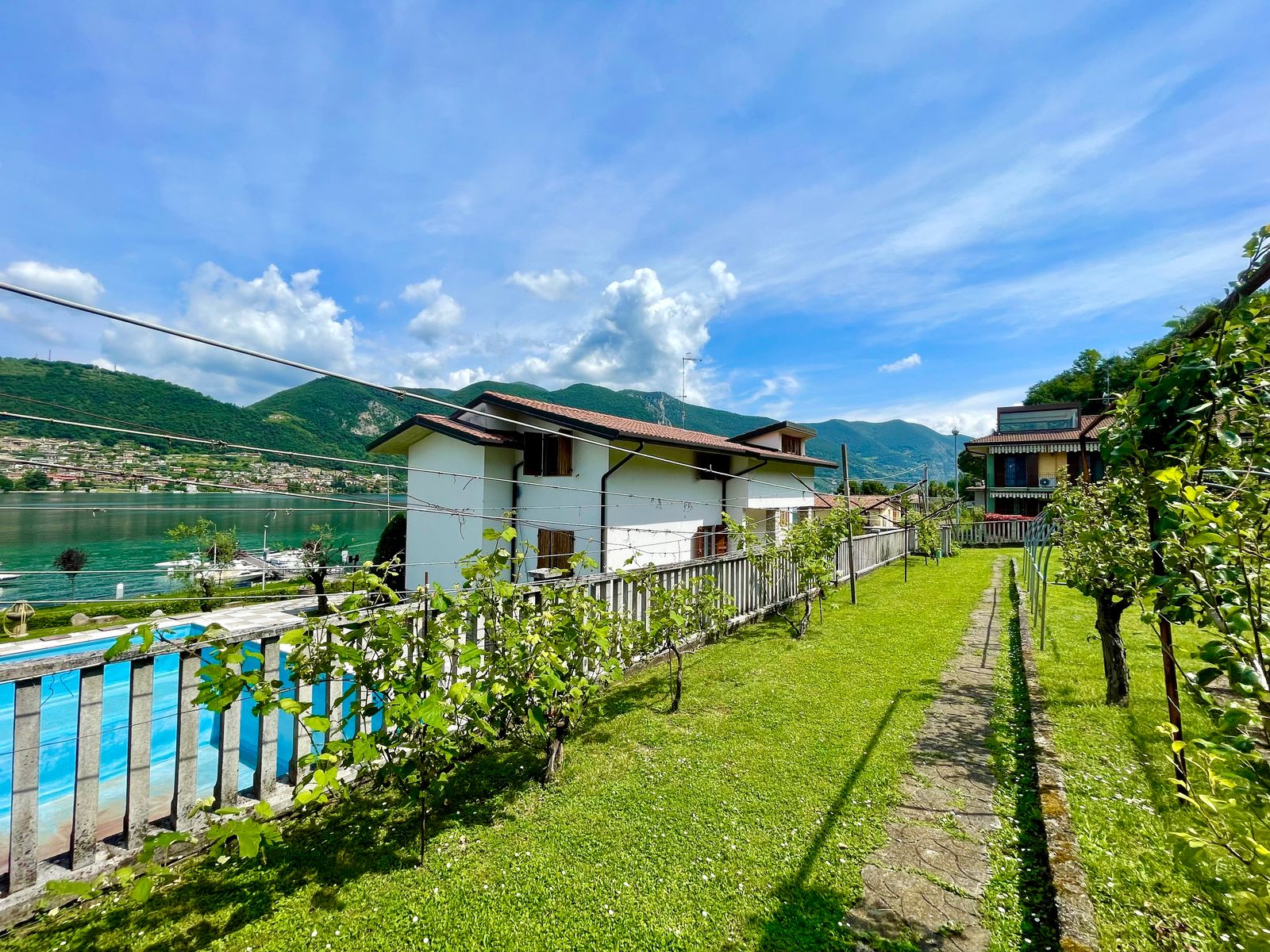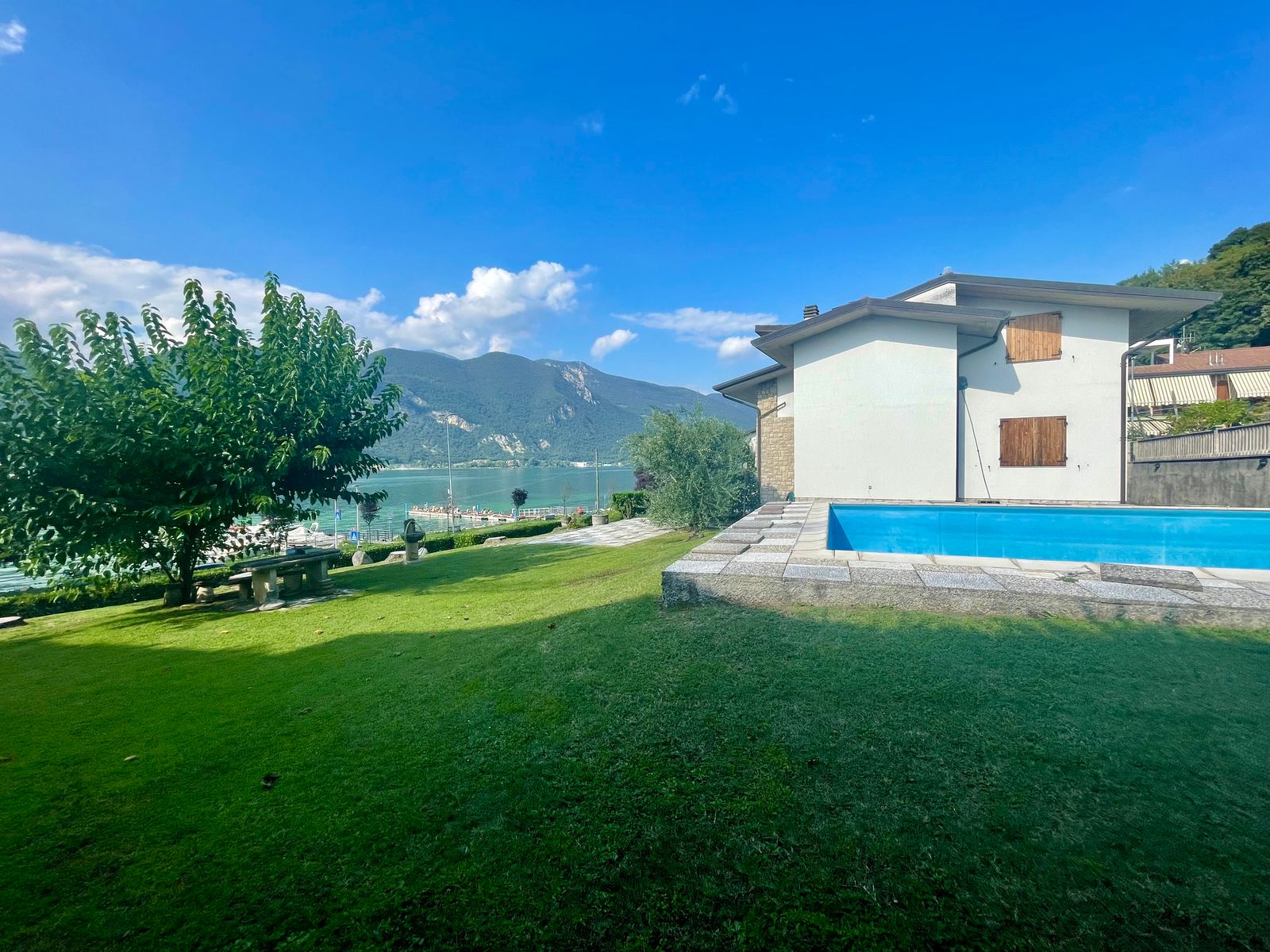 L’accesso alla casa è sia frontale dalla strada che lateralmente dall’ampio box triplo posto nel piano seminterrato e dalla corte. Al piano terra troviamo un grande giardino di proprietà di ben 1000 mq con piscina, corte retrostante con posti auto scoperti, ulteriore giardino terrazzato di proprietà esclusiva di 490 mq, ampia terrazza vista lago, soggiorno, cucina separata, due camere da letto matrimoniali ed un bagno; quanto al piano primo troviamo un soggiorno con balcone vista lago, cucina separata, tre stanze, bagno e ripostiglio