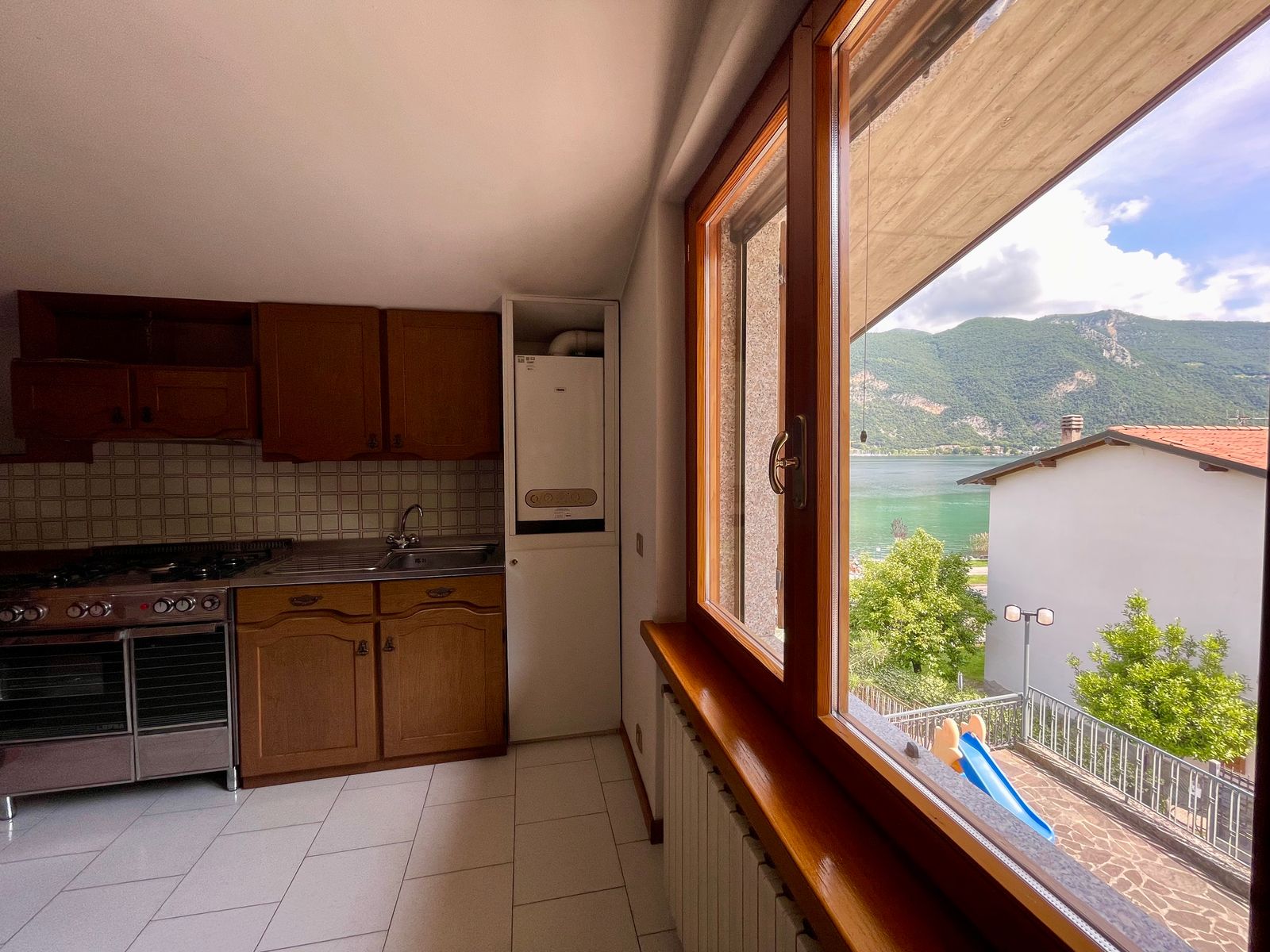 On the first floor, there is a living room with a lake-view balcony, a separate kitchen, three rooms, a bathroom, and a storage room.